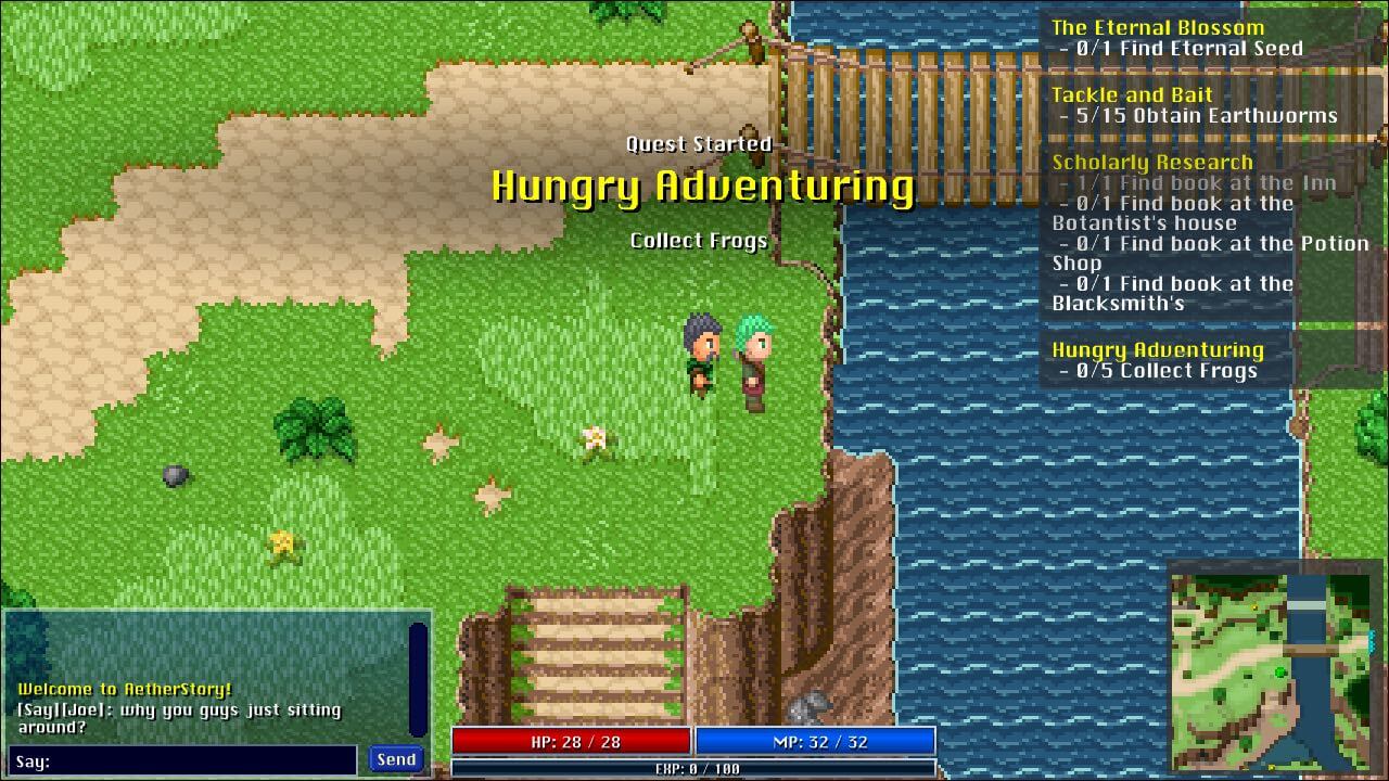 Derzeit besteht Aether Story aus reinen Fetch Quests, sprich, ihr müsst Dinge sammeln und dann beim Questgeber abliefern. Sowohl mit den Richtungstasten als auch mit der WASD-Mechanik dürft ihr euren Charakter steuern. Mit Enter könnt ihr den Chat bedienen – das ist aus MMO-Spielen hinlänglich bekannt. Die Figuren, die als BewohnerInnen der Welt fungieren, haben allesamt etwas zu sagen und können mit pointierten Aussagen und witzigen Textpassagen aufwarten. Dieses Game ist ein Werk voller Liebe zum Detail, das ist rasch ersichtlich.