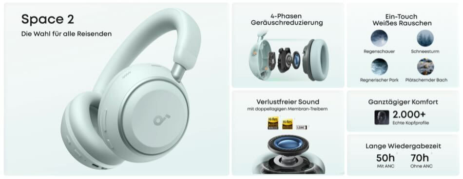 Klangtechnisch haben die Space 2 viel zu bieten: So wird Hi-Res Audio per Kabel unterstützt, kabellos trumpfen sie mit dem hochwertigen LDAC-Standard auf. Auch die Akku-Expertise von ANKER findet sich in den soundcore Space 2 wieder: Sie erreichen bis zu 50 Stunden Akkulaufzeit mit aktiviertem ANC und bis zu 70 Stunden ohne ANC, während eine fünfminütige Schnellladung Energie für bis zu vier zusätzliche Stunden Wiedergabe liefert. Für Anrufe unterwegs sind die Kopfhörer mit einem KI-gestützten Mikrofonsystem mit drei Mikrofonen ausgestattet. Features wie die smarte Trageerkennung, der praktische Transparenzmodus und die Kopplung zweier Geräte gleichzeitig runden das starke Preis-Leistungs-Gesamtpaket ab. Was haltet ihr davon?
