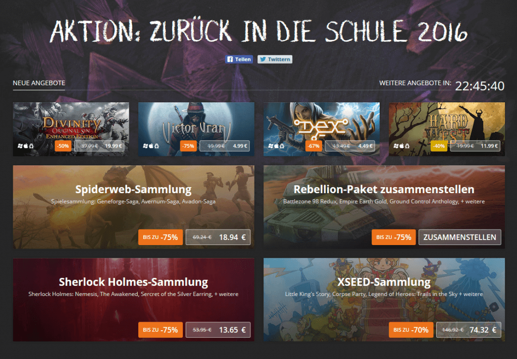 Wer seine GOG-Bibliothek auch mit Spielen erweitern möchte, die er/sie noch nicht besitzt, hat jetzt im „Back To School Sale“ Gelegenheit dazu. Spezielle Deals für über 300 Spiele werden geboten. Regelmäßiges Reinschauen lohnt sich, da sich die Angebote täglich ändern. Meine persönlichen, momentanen Highlights der Aktion „Zurück in die Schule 2016“ sind eindeutig The Masquerade – Bloodlines, Day of the Tentacle Remastered und Dragon Age: Origins – Ultimate Edition, die alle für 6-8€ erhältlich sind.