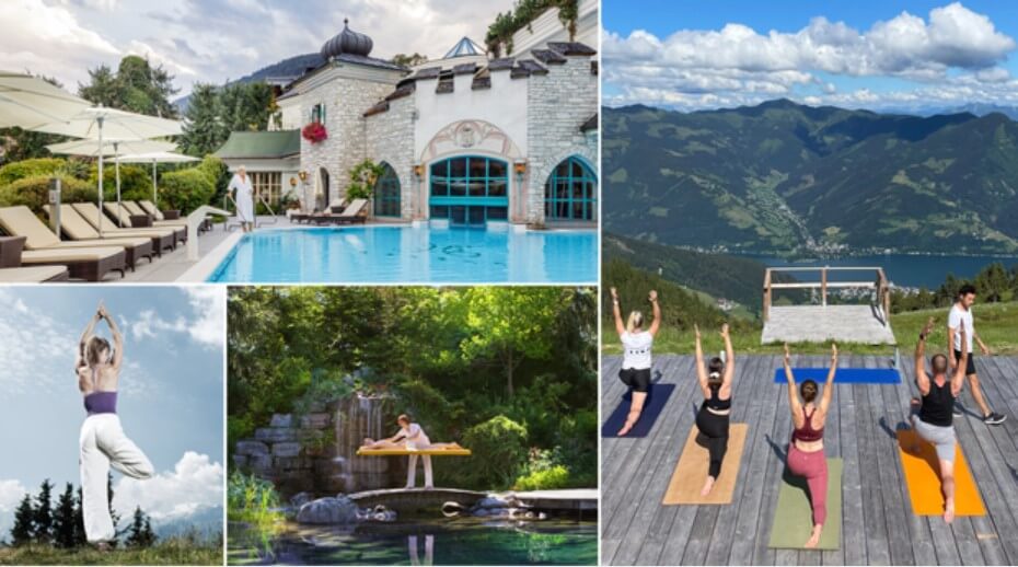 Oben links: Wellness-Schlössl mit Pool, ©Jessica Alice Hath Fotografie | Unten links: Yoga auf der Schmittenhöhe, ©Schmittenhöhebahn AG/Johannes Felsch | Unten mitte: Wellnessbehandlung im Freien, ©Paul Dahan | Rechts: Yoga auf der Schmittenhöhe, ©Zell am See-Kaprun Tourismus