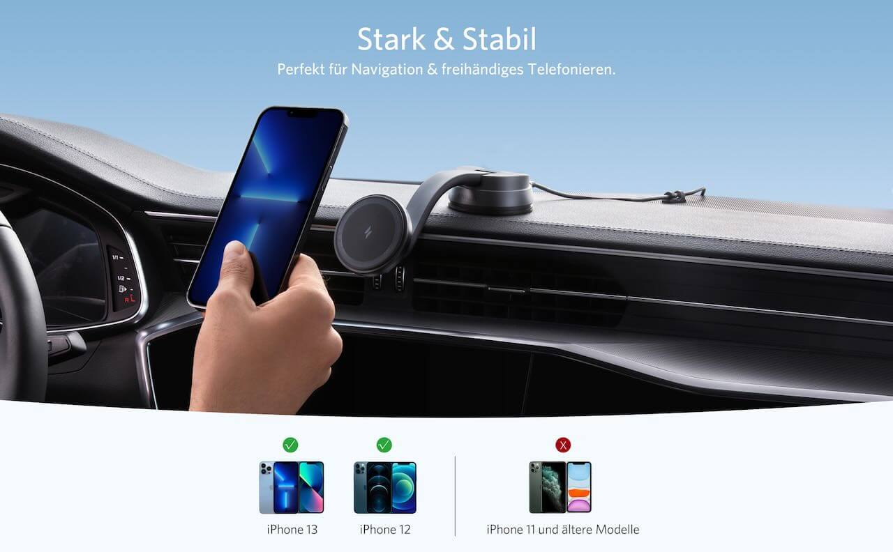Geht man nach der offiziellen Website des Produkts von Anker, müsst ihr euch um nichts mehr Gedanken machen. Einfach den Magneten vertrauen und auf das Fahren konzentrieren, so heißt es – für den sicheren Halt sorgen nicht nur der MagSafe-Standard, sondern auch ein starker Saugnapf auf der Gegenseite. Zudem kann der Anker 613 Magnetic Wireless Charger (MagGo) ganz einfach positioniert werden, der Hersteller verspricht dabei mögliche Betrachtungswinkel von bis zu 134°, die das Produkt anbietet. Nicht nur das, die magnetische Ladefläche leuchtet auch ganz schwach, sodass ihr selbst im Dunklen euer iPhone problemlos an die Halterung docken könnt. Mitgeliefert werden übrigens ein 1,5 m langes USB-C-Kabel, vier Kabelbinder, ein selbstklebendes Pad sowie eine Bedienungsanleitung. Hier seht ihr unser Unboxing-Video des Produkts: