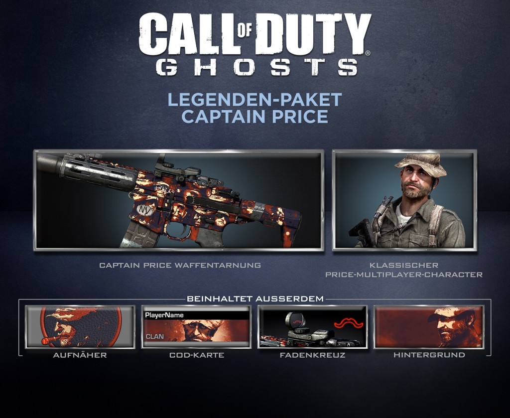 Das „Legendenpaket Captain Price“ bringt einen der legendärsten Call of Duty-Charaktere ins Spiel. Neben Captain Price als spielbarem Multiplayer-Charakter beinhaltet das Paket zum Preis von 3,99 Euro eine spezielle Waffentarnung, einen Aufnäher und eine CoD-Karte sowie einen  Hintergrund und den typischen Captain-Price-Schnurrbart als neues Fadenkreuz.