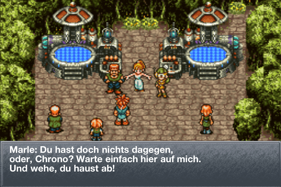 Ihr spielt in Chrono Trigger den Protagonisten Chrono. In seinem Heimatdorf wird ein Jahrtausendfest abgehalten, wo er seine Freundin Lucca besuchen möchte. Er stößt allerdings auf die interessante Marle, die sich ihm quietschfidel aufdrängt und fortan nicht mehr von Chronos Seite weicht. Neben den Feierlichkeiten gibt es etwas, was dem Fest die Show stiehlt. Lucca und ihr Vater präsentieren Technologie, mit der man Objekte zwischen zwei Kabinen hin und her teleportieren kann.