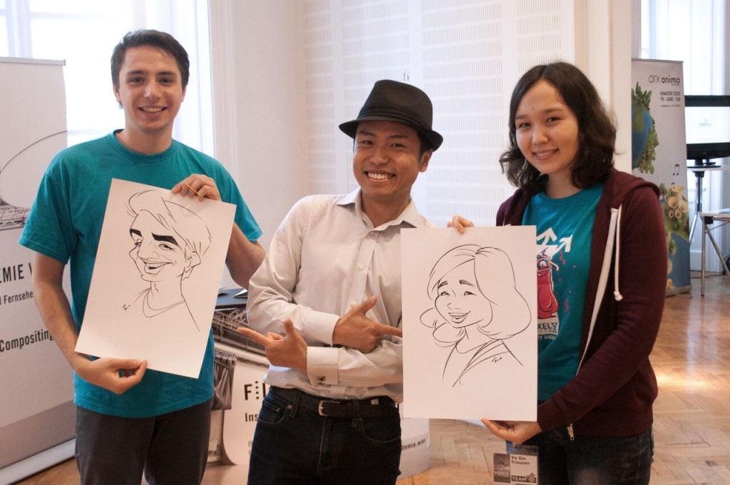 Zwischen spannenden Vorträgen hatte man beim Buffet die Möglichkeit, sich mit anderen BesucherInnen auszutauschen. Als schöne Erinnerung an das Event konnte man sich von Xi Ding als Karikatur malen lassen, der so charmant war und sich bei Frauen mit großen Nasen und schielenden Augen mehr zurückhielt als bei Männern.