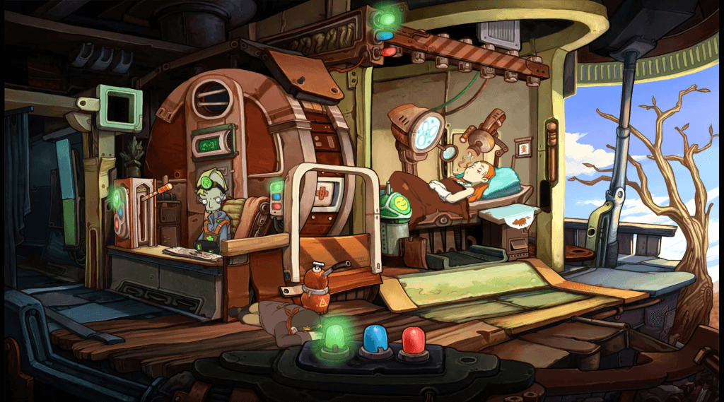 Die Steuerung in Deponia ist selbst für ein Adventure simpel: Die linke Maustaste ist für Aktionen reserviert, mit Rechtsklick betrachtet man Gegenstände. Klickt man auf das Mausrad, werden alle Aktionspunkte auf dem Bildschirm angezeigt und dreht man das Mausrad nach unten, wird das Inventar aufgerufen.