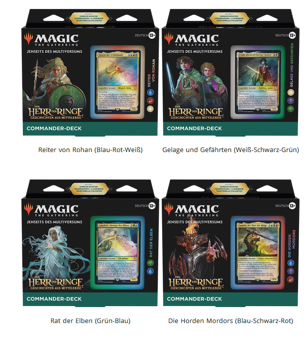 Es gibt hier vier vorgefertigte Decks (hier findet ihr die vier Decklisten, zu den wirklich sehr schön gemachten Decks; ich selbst habe mir die Reiter von Rohan geholt) und damit könnt ihr mit ca. 40 bis 50 Euro sofort out of the Box loslegen und spielen. Da Commander nicht eins gegen eins ist, sondern im Idealfall zu viert gespielt wird, entscheiden hier nicht nur die Stärke der Karten, sondern auch das Verhandeln mit den Mitspieler:innen. Für mich ist das eine der coolsten Modi, denn er ist super gesellig, dauert auch deutlich länger als ein eins gegen eins und man lernt schnell beim Spielen. Solltet ihr nun aber keine drei Freund:innen haben, die ebenfalls Magic spielen, kann euch die Magic Companion App weiterhelfen. Damit könnt ihr nicht nur eure Lebenspunkte tracken und Kartenregeln nachlesen, sondern auch Stores in eurer Nähe suche in denen Magic gespielt wird. Bei mir in Graz sind das zumindest zwei Läden und jeden Donnerstag ist Commander Night, wo euch Neulinge herzlich willkommen sind und freundlich und einfach casual gespielt wird. Ich für meinen Teil habe das Glück, dass drei Freunde von mir sich die jeweils anderen Precon Decks geholt haben und wir nun Elfen, gegen Reiter von Rohan, gegen Hobbits, gegen Saurons Armee spielen können. Das ist eine großartige Erfahrung, besonders wenn ihr auch noch auf Der Herr der Ringe steht. Ihr könnt euch natürlich auch jedes andere Precon Commander Deck anschauen und entscheiden welches euch am meisten zusagt.