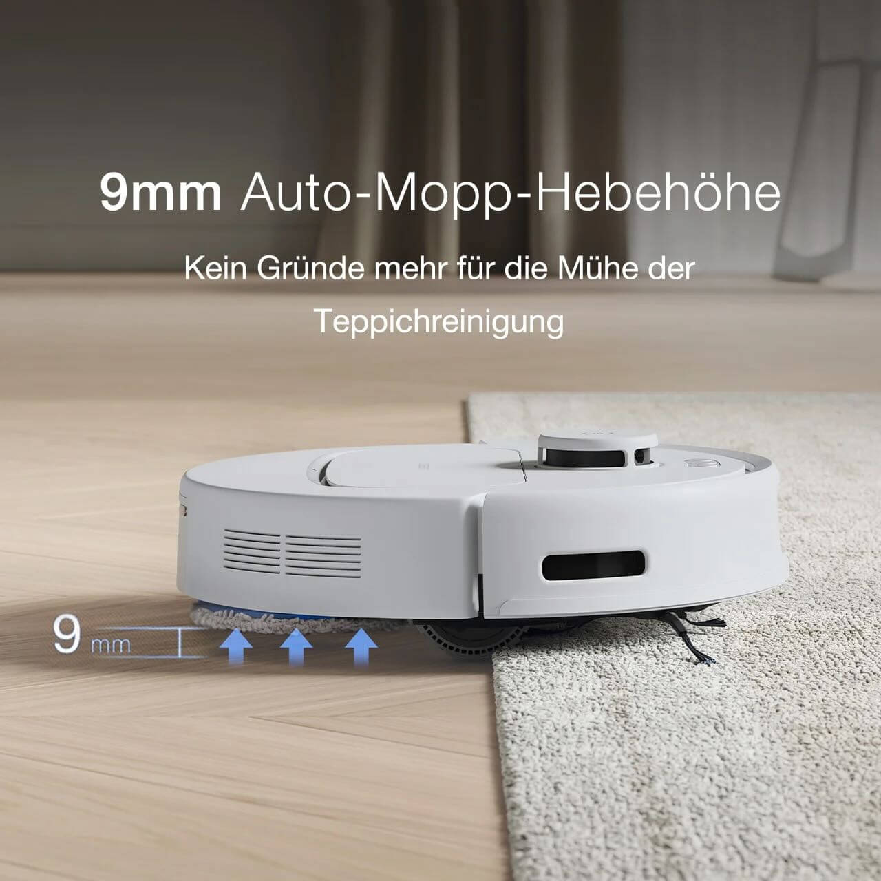 Vielleicht habt ihr das schon mal von Bekannten gehört: Beim Einsatz eines Saugroboters muss man ja immer aufpassen, dass alles vor der Reinigung aufgeräumt ist. Spielsachen, Schuhe, Kabel und dergleichen dürfen nicht herumliegen, da ansonsten der doofe Saugi einfach seine Seitenbürste darin verheddert und hängenbleibt. Hilflos steht er dann dort, sendet euch noch eine Benachrichtigung ans Handy, und das war’s mit der Reinigung ohne euer Zutun. Wie löst das der ECOVACS DEEBOT N30 PRO OMNI? Nun, er besitzt eine inkludierte Hinderniserkennung, die das Problem löst. Da er weiß, was sich um ihn herum befindet, kann er Spielsachen, Schüsseln, Bausteine und Stofftiere am Boden ausweichen. Erkennt er einen Teppich, hebt er seine Mopps um 9 mm an, damit dieser trocken bleibt!