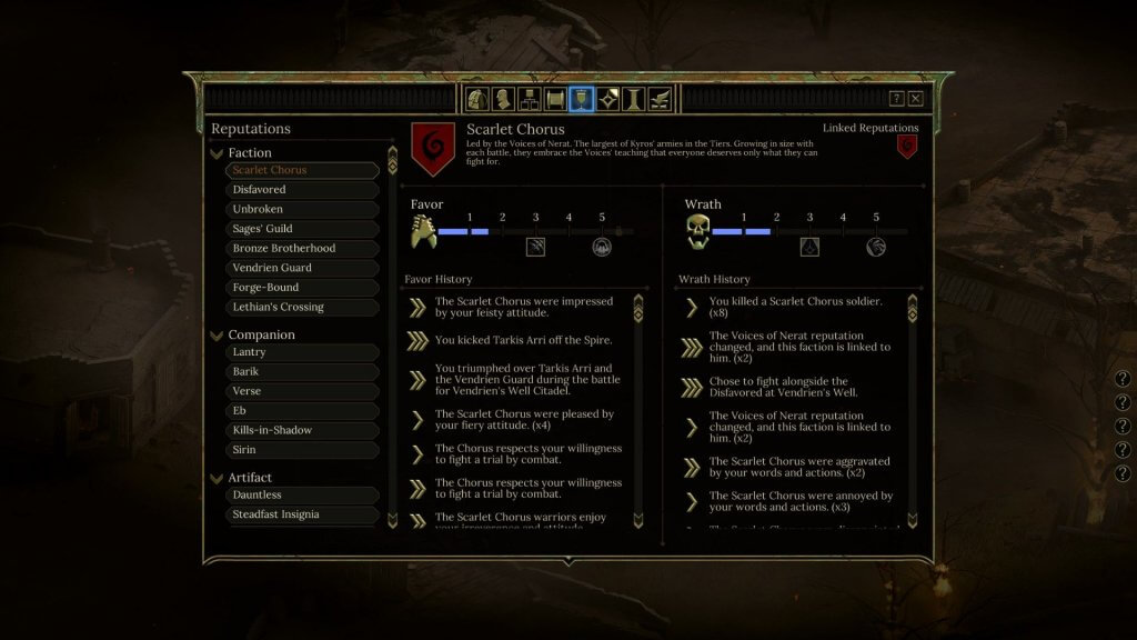 Ebenfalls noch nie in dieser Form gesehen habe ich das Reputationssystem von Tyranny. Je nach unseren Taten und Antworten in Dialogen ziehen wir uns die Sympathie oder den Zorn unterschiedlicher Fraktionen zu. Haben diese beiden Leisten gewisse Werte überschritten werden besondere Boni aktiv. Es kann sich also auch lohnen, gewisse Parteien gehörig zu verärgern. Während ich dieses System in der Theorie super finde, hat es in der Praxis dazu geführt, dass mein Schicksalsbinder keine wirkliche Persönlichkeit entwickelte sondern sich wie ein Fähnchen im Wind drehte. Mal sagte sie dieses, mal tat sie jenes, nur mit dem Ziel im Hinterkopf einen gewissen Bonus freizuschalten, was sich natürlich negativ auf die Immersionsfähigkeit auswirkte. Andere mögen da standhafter sein, ich war es nicht.