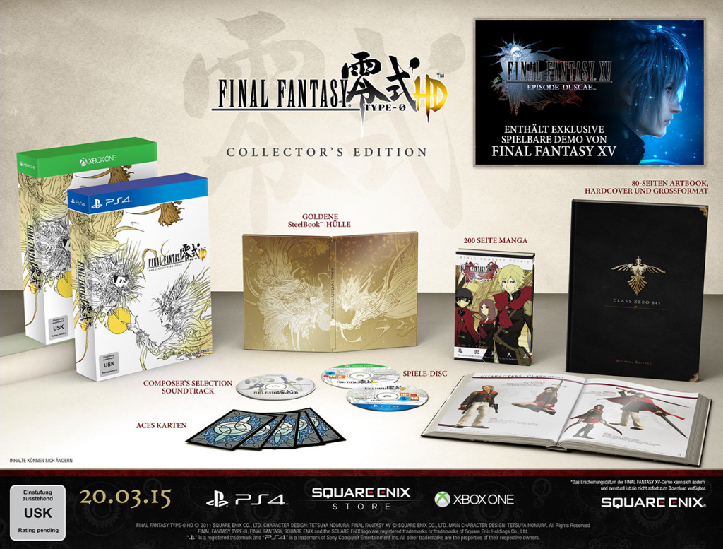 Square Enix kündigte nun eine Collector’s Edition zum JRPG Final Fantasy Type-0 HD, an, das laut letzten Informationen am 20. März 2015 für die PS4 und Xbox One erscheinen soll. Die Sammleredition wird mit 89,99 Euro zu Buche schlagen und folgende Extras beinhalten: