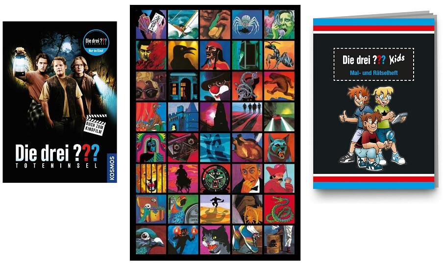 Zum kommenden Film erscheinen bei KOSMOS „Die drei ??? Toteninsel – Das Buch zum Film“ mit zahlreichen Szenenfotos sowie „Die drei ??? Toteninsel – Das Spiel zum Kinofilm“, das den neuen Fall für zwei bis vier Personen ab acht Jahren spielerisch aufgreift. Zudem erweitern das „Die drei ??? Erstlese-Buch zum Film – Toteninsel“, das Kindern ab sieben Jahren anhand der Filmgeschichte beim Lesenlernen unterstützt, sowie das „Die drei ??? Freundebuch“, ein Eintragebuch mit Originalfotos aus dem Film, die Reihe. Darüber hinaus ist mit „Die Auferstehung“ von Andreas Eschbach ein eigenständiger Roman erschienen, der die Kultdetektive in einer außergewöhnlichen, literarisch erzählten Zukunftsvision neu interpretiert und bereits Platz 1 der SPIEGEL-Bestsellerliste erreicht hat.