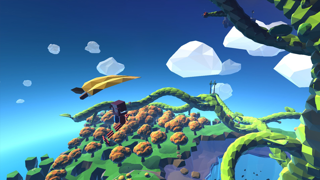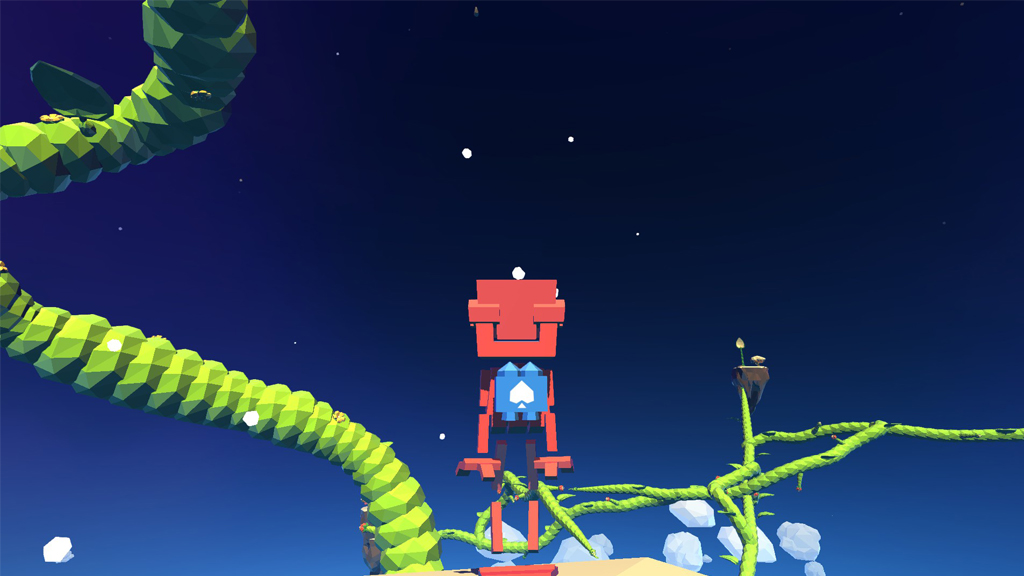 Zum Glück wächst auf der Insel auch eine riesige Pflanze, die ein wenig an eine außerirdische Bohnenranke erinnert. Neben einer riesigen Knospe hat diese auch ein paar kleine Triebe, die der kleine Roboter zum Austreiben bringen kann. Klammert ihr euch an einen solchen fest und drückt die entsprechende Taste, schießt der Trieb los und lässt sich von euch lenken. Ein gewisses Eigenleben der Pflanze macht den Ritt zu einer rodeomäßigen Erfahrung. Wie M.O.M. euch erklärt, müsst ihr die Spacepflanze mit Nährstoffen versorgen, indem ihr die Triebe mit den im Level verteilten, schwebenden Energiefelsen verbindet. Mit jedem neuen angezapften Felsen wächst der Haupttrieb weiter in die Höhe und hilft euch so, immer weiter nach oben zu klettern. Wiederholt ihr den Prozess ein paarmal, erreicht ihr die nächste große schwebende Insel. Um zu vermeiden, dass B.U.D. bei jedem Absturz quasi ganz von vorne anfangen muss, sind Teleporter im Level verteilt, die er aktivieren kann und die als Checkpoints dienen. Neben den Kristallen die – wenn ihr sie brav einsammelt – von Zeit zu Zeit Upgrades für euer Jetpack freischalten, gibt es auch andere Dinge zu entdecken. Auch Tiere findet ihr ab und an auf den satten grünen Weiden der Himmelsinseln. Die Viecher, wie zum Beispiel Schafe, beachten euch zwar kaum, wenn ihr sie aber greift, könnt ihr euch durchaus mal als Hirte versuchen und sie herumtreiben. Besonders cool sind auch die Blumen, die B.U.D. wie einen Fallschirm einsetzten kann und die Blätter, die ihm sogar erlauben, durch die Lüfte zu segeln. Ansonsten gibt es zwar per se nichts zu tun, aber umso mehr zu entdecken. Trotz des reduzierten Artstyles sind die Umgebungen wunderschön anzusehen und motivieren so zum Flanieren und Erkunden.