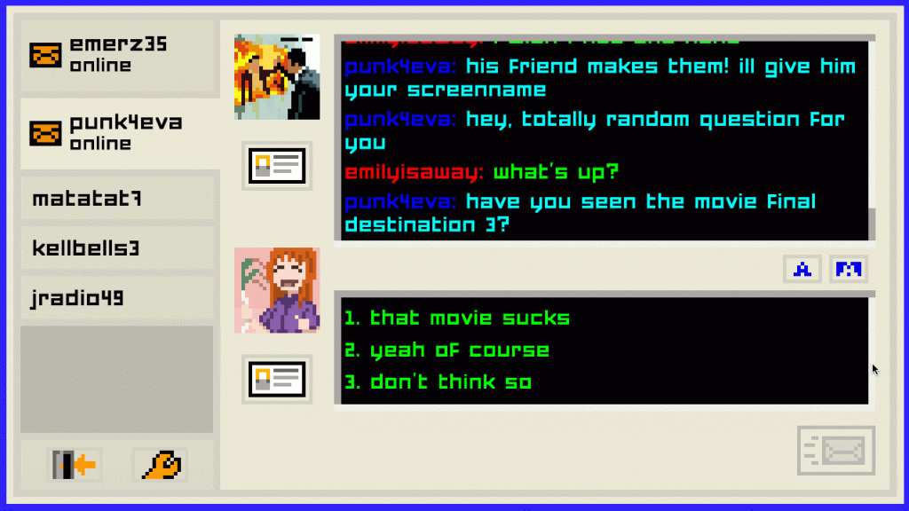 Emily Is Away ist ein kleiner, recht linearer Instant-Messenger-Simulator, den es kostenlos auf Steam zu spielen gibt. Darin erlebt man als Junge, der in Emily verliebt ist, einige Chatgespräche zwischen diesem und Emily mit. In dem kurzen Spiel wurde berührend eine Geschichte darüber erzählt, wie sich zwei Leute nach und nach entfremden.
