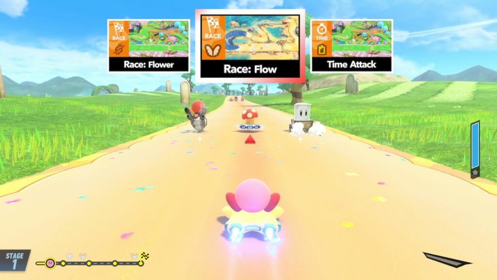 Das Menü (wer Super Smash Bros. Ultimate kennt, wird es sofort wiedererkennen) ist in schwarzem Text auf buntem Hintergrund designt und wirkt dabei so elegant wie zeitlos. Die Präsentation wirkt reif, selbstbewusst, die Musikbegleitung energetisch und motivierend. Noch bevor man sein erstes Rennen startet, erwartet einen eine Fahrschule, die Sakurai und sein Team bewusst eingebaut haben, um auch völlig Ungeübte an die Konzepte heranzuführen. Diese ist keine endlose Ansammlung von Textboxen, sondern besticht durch kleine, zielgerichtete Lektionen, die sich auf konkrete Manöver konzentrieren. Ihr lernt, wie ihr bremst, driftet, boostet oder wie man mit dem Wirbelangriff attackiert.