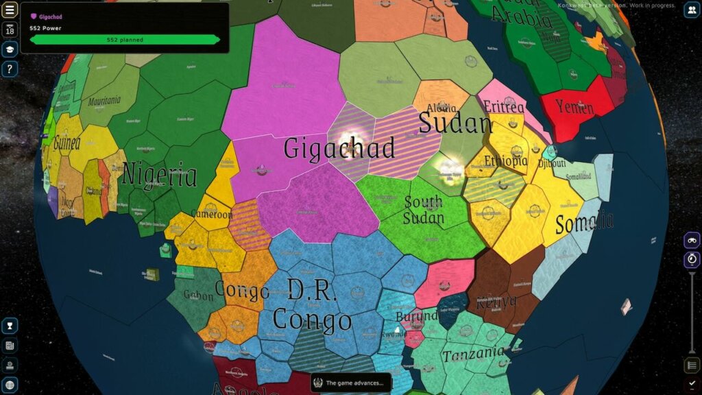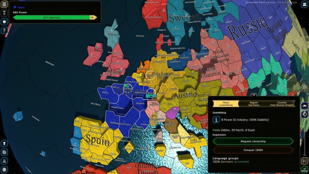 Nach mehreren unterhaltsamen Partien bin ich mir immer noch unschlüssig, was mein liebster Zugang zu Konkwest (zur offiziellen Website) ist. Natürlich macht es Spaß, als Großmacht wie die USA oder China zu starten und den Startvorteil zu nutzen, um zu einer unaufhaltsamen Macht zu werden. Damit geht aber auch eine ganz große Zielscheibe für Aggressoren einher, und da kann es auch attraktiv sein, mal mit einer kleineren und wesentlich unbedeutenderen Region wie etwa Österreich zu starten. Durch geschicktes Netzwerken und dem Aufbau der eigenen Industrie lässt sich so der eigene Fortschritt ziemlich stark beeinflussen, aber Vorsicht! Wer übermütig wird und sich vorschnell in Kriege verwickelt, der kommt nicht weit. Meine ersten Runden im Spiel habe ich nämlich als aggressiver Landlord verbracht, und am Ende habe ich mich nur auf der Stelle bewegt, da die Scharmützel an vielen Fronten den Fortschritt bremsten.