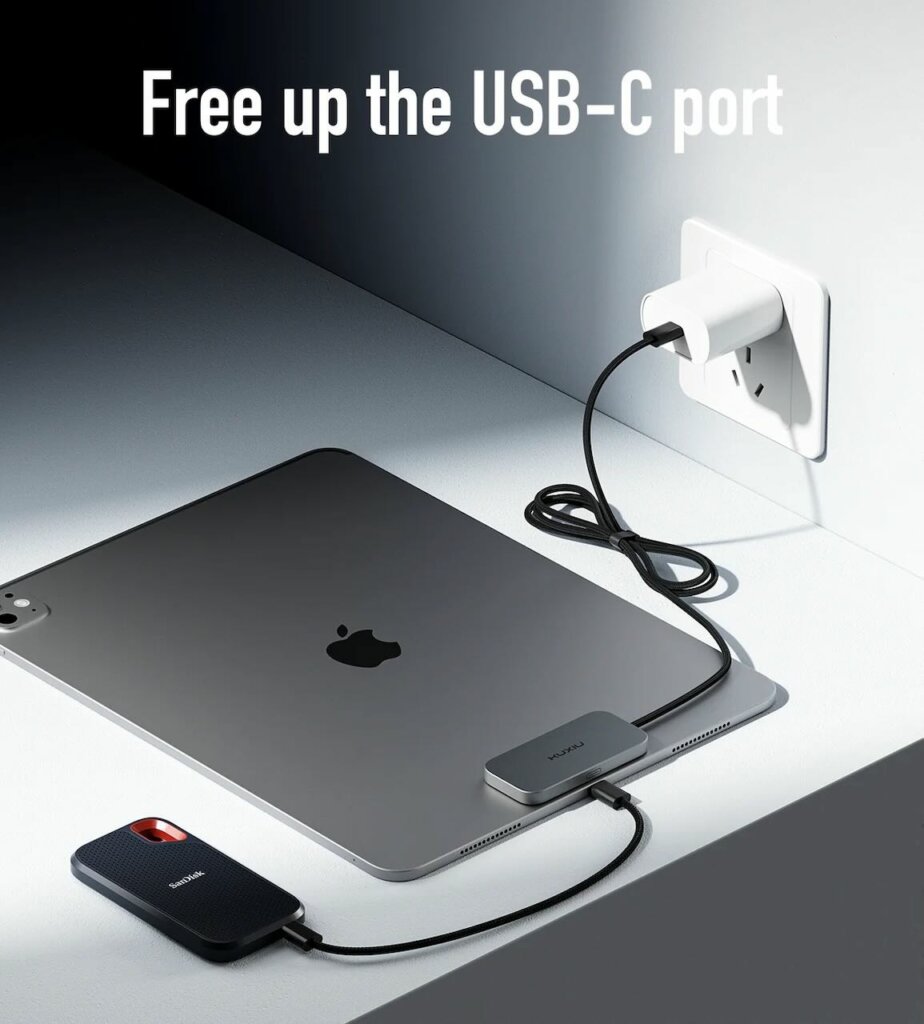 In der täglichen Nutzung überzeugt das KUXIU M30 durch seine Unkompliziertheit. Das magnetische Andocken funktioniert intuitiv und zuverlässig – kein Gefummel mit USB-C-Kabeln mehr. Besonders praktisch ist das Gerät, wenn das iPad beim Ansehen von Medien in einer Halterung steht. Hier zeigt sich der größte Vorteil: Der USB-C-Port bleibt frei für andere Geräte.