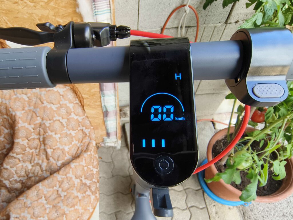 Im nächsten Schritt muss ich doch bestimmt erst mal das Gerät aufladen, um eine Testrunde zu drehen, oder? Auch hier überrascht der Hersteller mit einer Akkufüllung von rund 60%. Das finde ich mal richtig klasse! Natürlich empfehle ich euch, das Gerät gleich zu Beginn mal voll aufzuladen, damit die volle Ladekapazität erreicht wird, aber wenn es jemand – wie auch ich – nicht erwartet, so könnte man auch gleich losfahren. Hierfür muss nur der Scooter über das am Lenker befestigte LED-Display eingeschaltet und leicht Schwung genommen werden. Nun noch den Gashebel betätigen und schon fahrt ihr mit bis zu 20km/h durch die Gegend. Klasse!