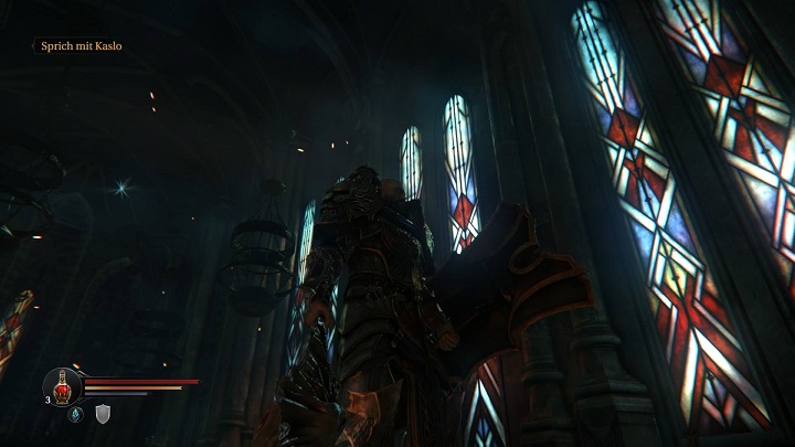 „No na“ sammelt ihr für gewonnene Kämpfe Erfahrung, die ihr am nächsten Savepoint einlagern und für Attributs-, beziehungsweise Magiepunkte zum Aufrüsten eurer Zaubertalente ausgeben könnt, aber nicht müsst. Wer nämlich in Lords of the Fallen aufs Ganze geht, und nicht nach jedem besiegten Feind zur Erfahrungsbank rennt, bekommt Vorteile in Form von häufigerem und vor allem besserem Loot, sowie einen XP-Multiplikator. Sterbt ihr doch, habt ihr ebenso wie bei Dark Souls eine letzte Chance, eure Punkte wiederzuerlangen, wobei aber erwähnt werden sollte, dass der Erfahrungsgeist beständig schwächer wird, bis er letztlich ganz verschwindet, wenn ihr euch zu viel Zeit lasst.