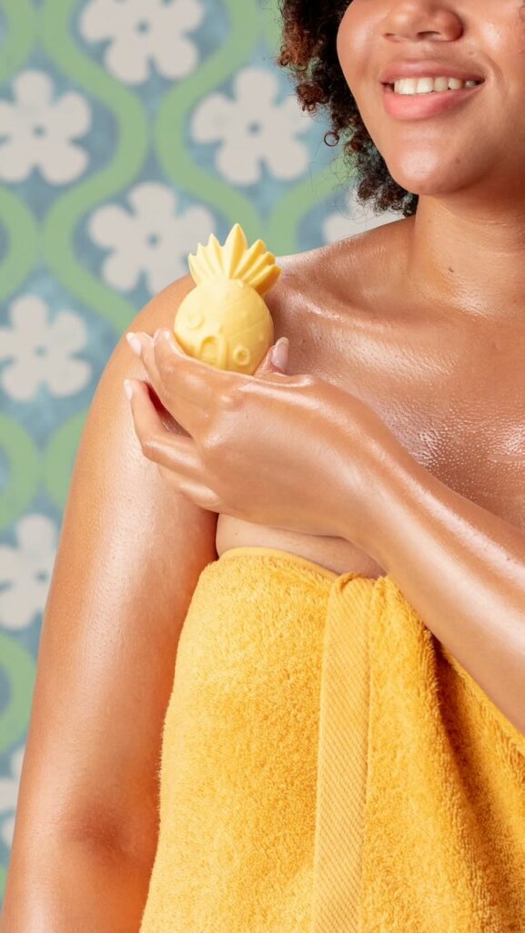 Werdet plastikfrei mit dieser Ananas unter dem Meer! Sagt „Ahoi!“ zu strahlend feuchtigkeitsversorgter Haut dank der Basis dieses unverpackten Balsams mit Sheabutter und Bio-Kakaobutter aus fairem Handel. Frischer Ananassaft und Davana-Öl verleihen eurer weichen Haut einen süßen, tropischen Duft wie eine Piña Colada beim Sundowner. Das Körperbalsam ist auf der LUSH-Webseite um € 12,95 pro Stück erhältlich.