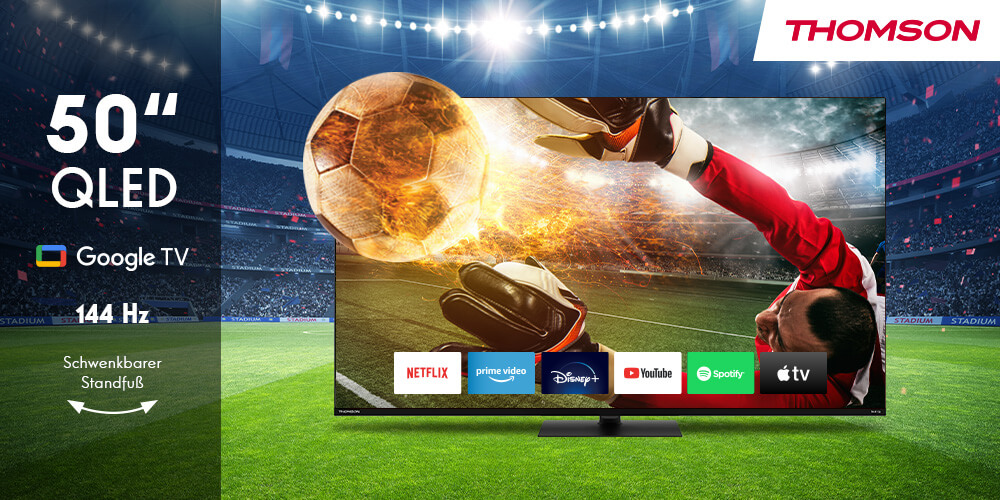 Die Fußball-Europameisterschaft in Deutschland und die Olympischen Spiele in Paris lassen die Herzen von unzähligen Sportfans in diesen Tagen höherschlagen. Wer nicht live vor Ort dabei sein kann, erlebt mit der neuesten 144Hz-Technologie des THOMSON QLED Pro jedes Tor oder jeden Weltrekord auf beeindruckende Weise. Die QLED Pro-Modelle mit Google TV liefern brillante, flüssige Bilder und einen Sound in Stadionqualität. So wird das Wohnzimmer zur ausverkauften, stimmungsvollen Arena.