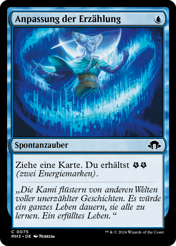Kommen wir daher zu weiteren prominenten Keywords: Was machen wir wenn Mana nicht ausreicht? Richtig, wir nutzen Energie! Meistens spielt ihr Karten wie das blaue Anpassung der Erzählung, um einen Effekt zu erzielen und Energie zu bekommen.