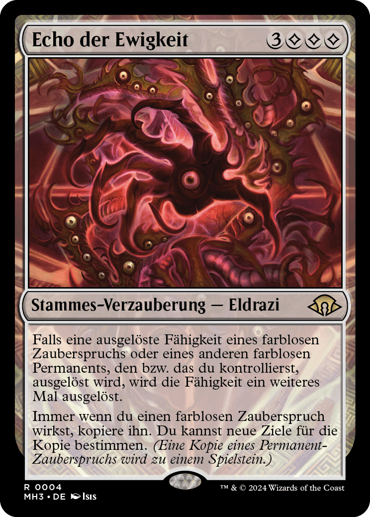 Los geht’s: Ihr spielt den Fleischschaber, der wird kopiert, zahlt den Ulalek Trigger, zahlt nochmal den Ulalek Trigger, weil der ja von Echo der Ewigkeit verdoppelt wird. Startet jetzt ein Loop wo Ulalek und Echo sich gegenseitig triggern? Muss ich dann noch Mana zahlen oder sind die Kosten im kopierten Trigger schon gezahlt? Ist es kein Loop und ich muss noch ein Wechselbalg hinterher spielen? Wieviel Fleischschaber ergeben einen Emrakul und wo sind meine Eichhörnchen? Ich habe keine Ahnung, aber wenn ihr das wisst, schreibt mir gerne einen Kommentar hier drunter.
