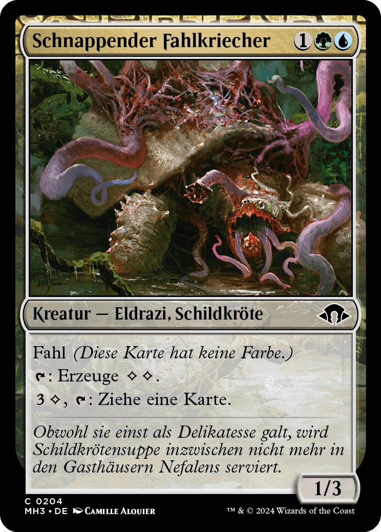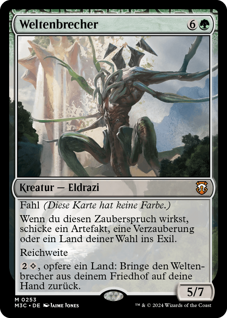 Wir wissen nun also, dass es sich um stärkere, teurere Karten handelt und die allermeisten Karten sind im Format Commander, Modern, Vintage und Legacy erlaubt. Wie immer möchte ich nun mit den Mechaniken der Edition beginnen. Es gibt zwar kein klassisches Theme wie z.B. bei Outlaws von Thunder Junction (hier geht’s zu unserem Review), jedoch werdet ihr die Mechaniken bzw. Kreaturtypen Eldrazi/farbloses Mana, Energie, doppelseitige Karten, Schattenbeistand (Umbra Armor), Göttergabe (Bestow), Fahl (Devoid), Modifiziert, Adaptieren, Vernichter (Annihilator) oft vorfinden. Hört man das Wort Eldrazi schießt bei Magic Veteranen sofort der Begriff „Eldrazi Winter“ und der damit einhergehende Winter 2016 ein. Was waren das für Zeiten, wo man mit Das Auge von Ugin und Eldrazi-Tempel riesige Eldrazi-Ungetüme aufs Feld pumpen konnte?