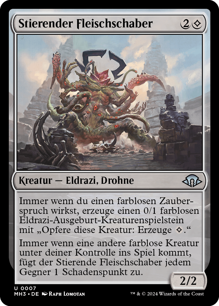 Ulalek triggert erneut, ihr bezahlt und am Stack liegen zwei Weltenbrecher plus ihre Cast Trigger und ein Wechselbalg. Durch die erneute Verdopellung bekommt ihr vier Weltenbrecher samt Cast Trigger und zwei Wechselbalg Einsätze. Und das ist noch nicht alles! Spielt ihr vor dem Kopieren andere Spontanzauber, die nicht Eldrazi sind und am Ende einen Eldrazi Zauberspruch werden einfach alle anderen Spontanzauber einfach mitkopiert. Das ist ziemlich cool und deshalb ist auch Aufblitzen ein sehr wichtiges Thema für dieses Deck. Ein letztes Beispiel habe ich aber noch, denn ich finde die neue Karte Stierender Fleischschaber absolut grandios in diesem Deck. Die hat einen Cast Trigger, den ihr mitkopieren könnt und einen ETB-Trigger (kommt ins Spiel).