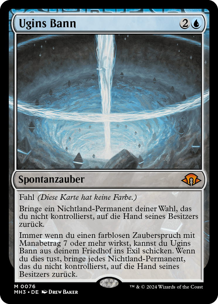 Spielen eure Gegner gerade keine einfärbigen Decks, ist zumindest deren Commander Geschichte. Die meisten Commander Decks sind aber ohnehin zwei- oder dreifärbig. Diese Karte wird einiges zerstören und abermals habt ihr nichts zu befürchten. Zieht ihr in einem Modern Horizons 3 Booster die Karte Ugins Bann, dann würde ich euch empfehlen diese sofort ins Deck zu mischen um die einseitigen Boardwipes zu komplettieren.