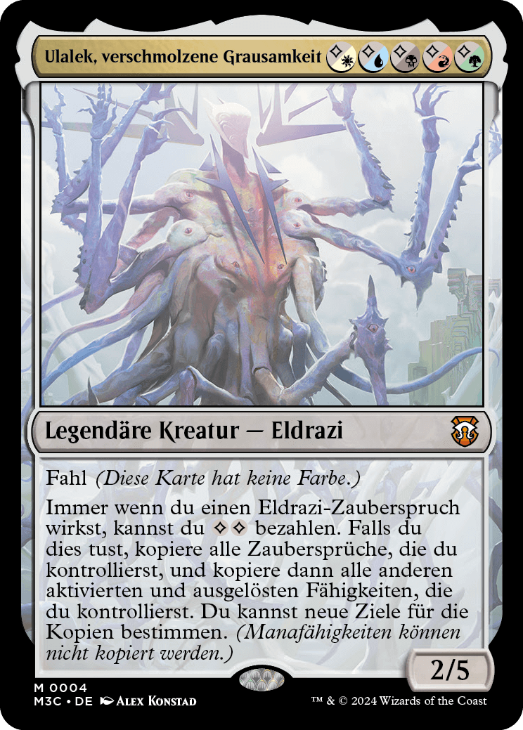 Unabhängig vom Preis, also spielerisch gesehen ist Eldrazi-Invasion aber natürlich ein ziemlich cooles Deck geworden. Das liegt nicht nur, aber auch am Commander dieses Decks. Auf den ersten Blick sieht man sofort eine erste Besonderheit. Normalerweise sind Eldrazi-Decks farblos, dieser Commander ist jedoch fünffärbig und ihr könnt damit auch auf alle seine Farben zugreifen. Und dann hat Ulalek, verschmolzene Grausamkeit (übrigens verschmolzen aus den beiden legendären Eldrazi Ulamog und Kozilek) diese absolut krasse Fähigkeit. Schnallt euch an, wir werden gemeinsam die untiefen des Stacks in Magic ergründen.