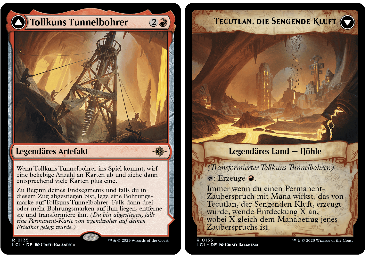 Dabei müsst ihr nicht nur die Manakosten zahlen, sondern, eine Zusatzbedingung erfüllen. Ihr müsst die Karte an sich ins Exil und wie im Beispiel zu sehen ein weiteres Artefakt ins Exil schicken. Dann dürft ihr die Karte transformieren. Mir gefällt der Gedanke in den tiefen Höhlen etwas aus mehreren Dingen zusammen zu bauen bzw. manchmal vielleicht sogar zu opfern. Weiters gibt es auch ganz normal transformierende Karten.