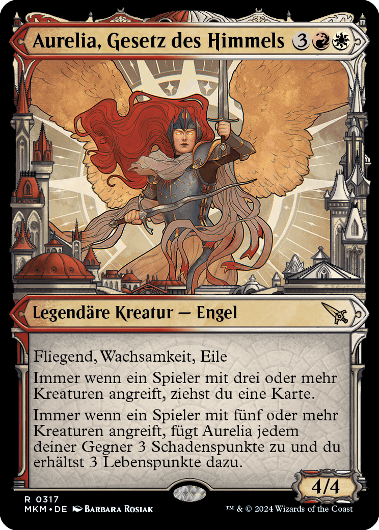 Praktischerweise habe ich dann auch noch Aurelia, Gesetz des Himmels gezogen und da war klar, es wird ein Boros Aggro Deck mit vielen, kleinen Kreaturen, ein paar Bombs und coolen Synergien, wenn ich oft und mit vielen Kreaturen angreife.