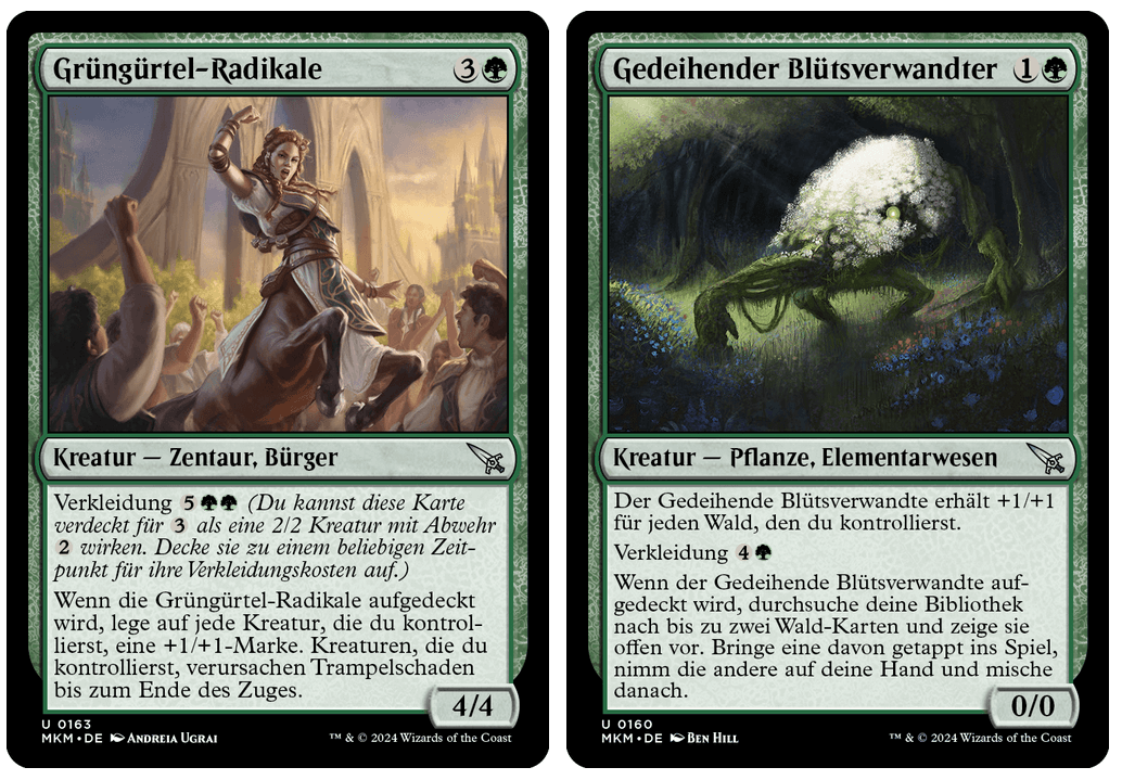 Der andere Grund ist, dass die vier neuen Mechaniken zu coolen Boardstates führen, die super zur Geheimniskrämerei und dem Krimifokus passen. Stellt euch vor, euer Gegner hat nicht nur drei Hinweis-Tokens vor sich, sondern auch mehrere getarnte Kreaturen mit denen er immer wieder angreift. Potenziell sind die Dinger ja nur 2/2, aber was wenn sie verkleidet aufgedeckt werden und ich gerade einen 6/6 nicht blocke? Besonders grün kann hier ganz schön schnell das Spiel beenden, wenn man einmal unachtsam nicht blockt.
