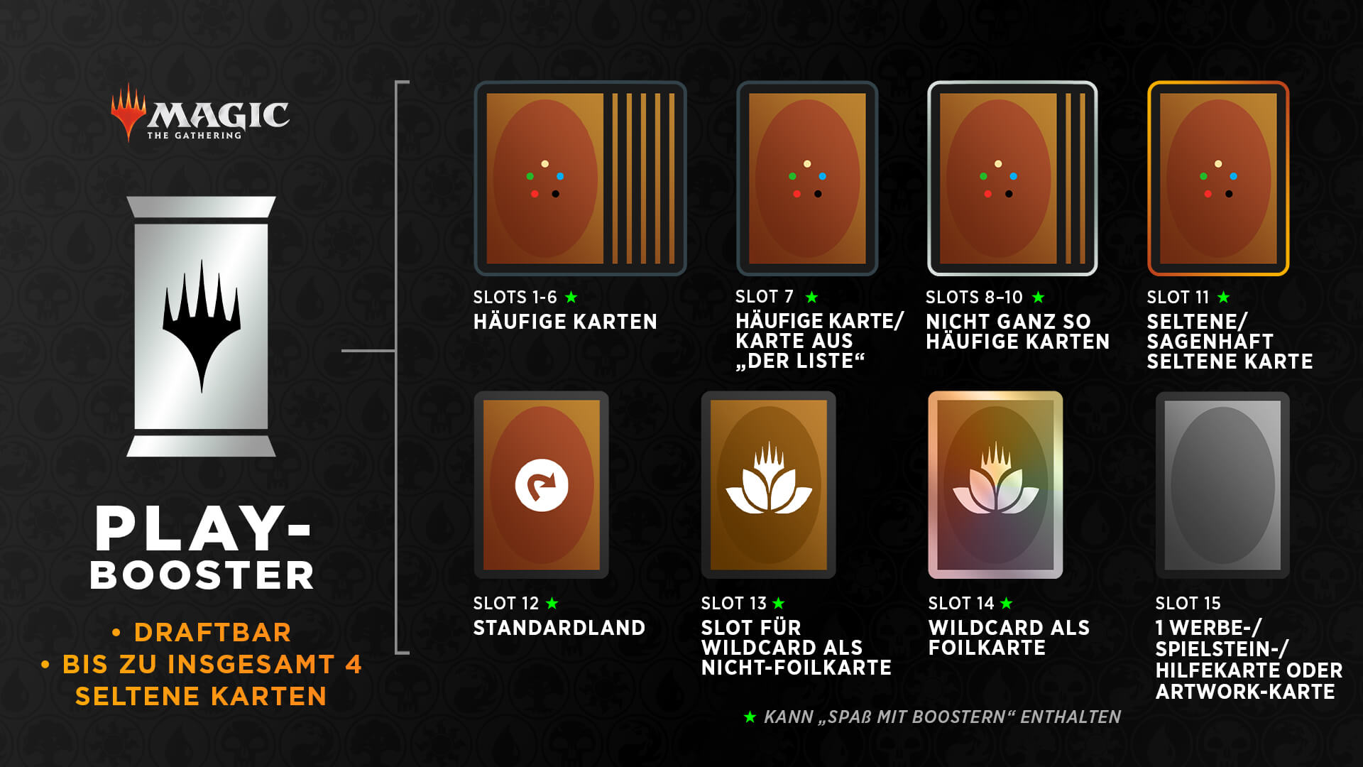 Es gibt aber noch einen dritten Grund warum mir das Prerelease Event mehr Spaß gemacht hat und das sind die neuen Playbooster, die hier auch gleich zum Einsatz kommen. Zur Erklärung: früher gab es Draft-, Set- und Sammler-Booster. Die Sammler-Booster bleiben bestehen, dies sind immer noch die mit Abstand teuersten Boosterpacks (ca. 22 Euro). Sie enthalten ausschließlich Foil-Karten und können auch sehr seltene, limitierte Collectors-Karten beinhalten. Um die soll es aber nicht gehen, denn die hat Wizard of the Coast nicht verändert. Viel mehr hat man Draft- und Set-Boosterpacks zusammengefasst und daraus die jetzigen Play-Booster (ca. 4,50 Euro) gemacht. Hier seht ihr die Wahrscheinlichkeiten und welche Karten ihr ziehen könnt: