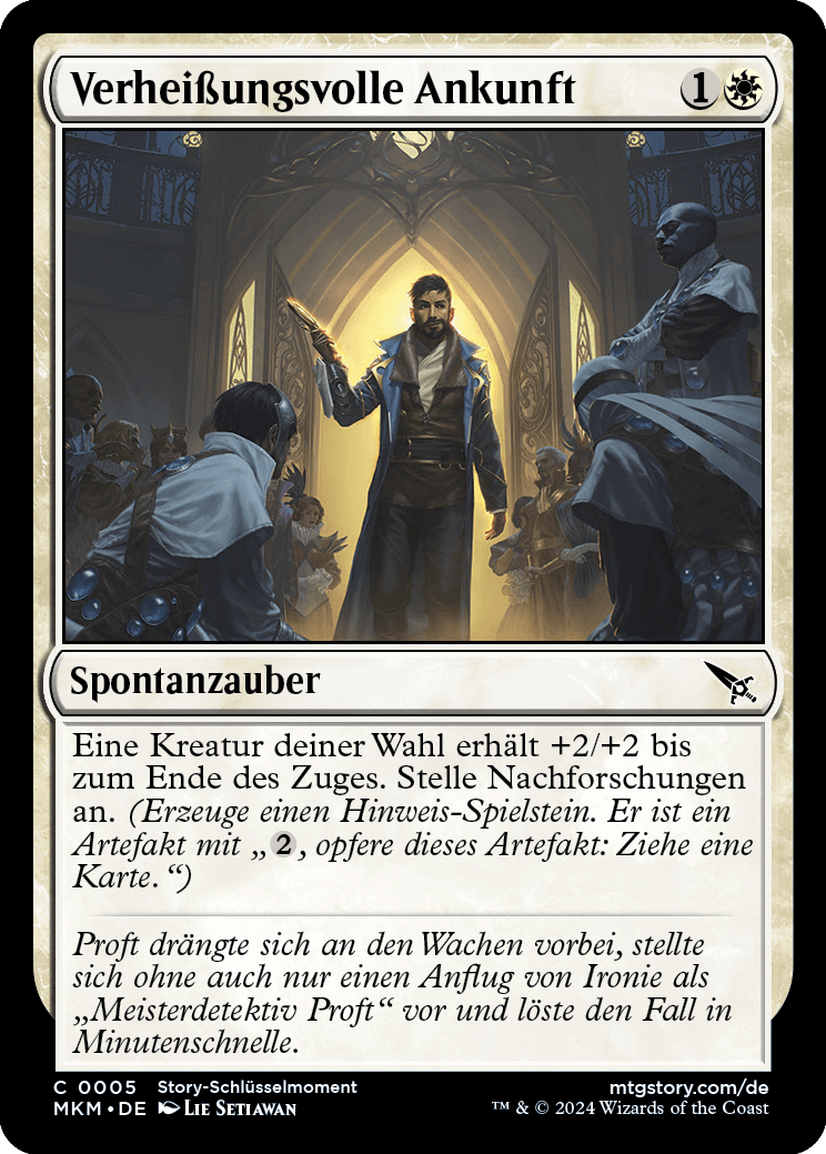 Wie z.B. auch Ixalan oder Wilds of Eldrain ist auch Mord in Karlov Manor ein topdown designtes Set. D.h. zuerst wurde das Setting und die Geschichten des Sets entworfen und dann die Mechaniken passend dazu entworfen. Deshalb dreht sich diesmal alles um die Detektivarbeit und ich habe Cluedo ja bereits erwähnt, dass im englischen Clue heißt. Investigate bzw. der damit eingeführte Clue-Spielstein ist daher großer Bestandteil von Mord in Karlov Manor. Zu Deutsch heißt das Ganze dan übringes Nachforschungen anstellen und ihr bekommt einen Hinweis-Spielstein: