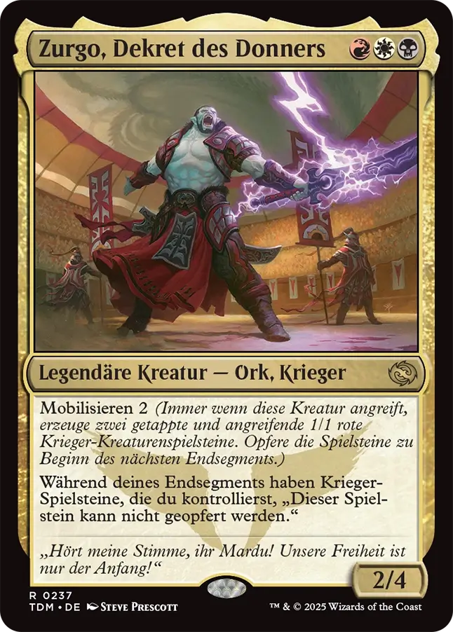 Mobilisieren n bedeutet, dass ihr bei einem Angriff der Kreatur n angreifende 1/1 Krieger-Kreaturspielsteine erstellt, die am Ende des Zuges wieder geopfert werden müssen. Die Mechanik ist gut ausbalanciert, fördert aggressives Spielen und gefällt mir deshalb sehr. Ich bin deshalb auch Mardu-Fan. Besonders schön ist es natürlich, wenn ihr den Mardu-farbenen Zurgo am Feld habt, denn dann können eure Spielsteine nicht geopfert werden und ihr bekommt ständig neuen Nachschub:
