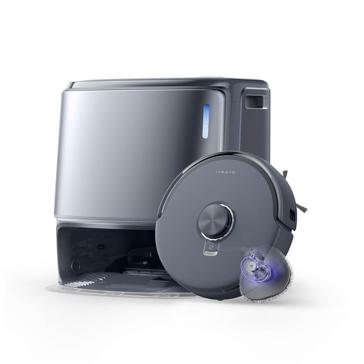 Beim Wischen setzt Narwal auf ein System mit zwei rotierenden Reinigungsmopps in dreieckiger Form, die sich mit 180 Umdrehungen pro Minute drehen und mit beachtlichen 800 Gramm Anpressdruck arbeiten. Diese Kombination soll selbst hartnäckige Flecken (sofern halt nicht hoffnungslos eingetrocknet) zuverlässig entfernen können. Die Mopps werden zudem während der Reinigung immer wieder mal gewaschen, dafür gibt es die Dockingstation. Dieses vollautomatische Multifunktionsdock ist ein wahres Multitalent. Es wäscht und trocknet die Wischmopps, entleert den Staubbehälter und versorgt den Roboter mit frischem Wasser. So verspricht der Hersteller bis zu 90 Tage autonomen Betrieb, was bedeutet, dass ihr wochenlang keine Hand anlegen müsst – klingt nach einem Traum für alle, die wenig Zeit für Haushaltsaufgaben haben. Packen wir den Traum mal aus!