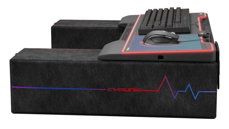 Praktische Seitentaschen zum Verstauen von Zubehör und Snacks gehören ebenso zur Ausstattung wie das intelligente Kabelmanagement-System im Inneren und insgesamt sechs USB-3.0-Anschlüssen, zwei davon auf der Oberseite des Boards. Vervollständigt wird der Couchmaster CYPUNK mit dem mitgelieferten XXL LED Mauspad. Das Design steht mit dem Rest des CYPUNK im Einklang und ergänzt das Gesamtkonzept auf perfekte Art und Weise. Das Mauspad bedeckt die volle Auflagefläche des Couchmaster CYPUNK und gibt mit passenden Aussparungen dem Look noch mehr Dynamik.