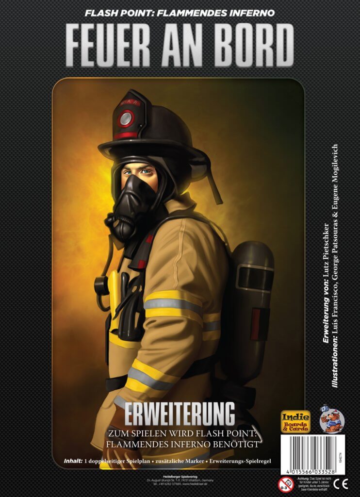 Das Spiel Flash Point: Flammendes Inferno sowie die beiden Erweiterungen Extreme Gefahr und Feuer an Bord sind bereits beim Heidelberger Spieleverlag erhältlich. Das kooperative Spiel ist für 2-6 Spieler/innen ab 10 Jahren geeignet. Eine Partie dauert etwa 45 Minuten.