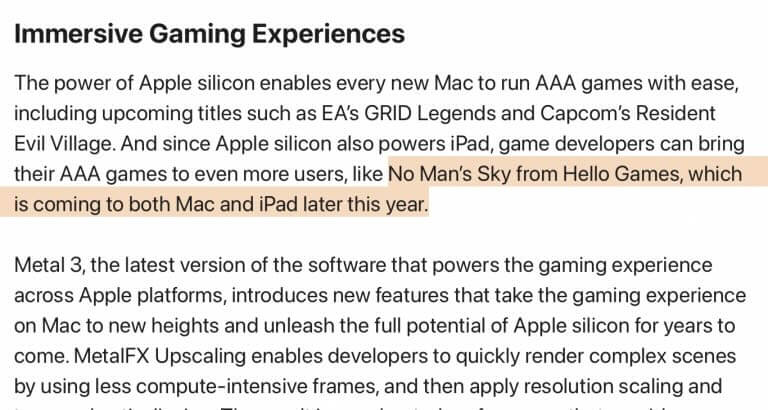 Die Keynote von Apple hat einiges abgearbeitet. Ein neues iOS, ein neues macOS, ein neues watchOS und mehr wurden vorgestellt. Selbst an der Hardware-Front konnte man sich erfreuen, so wurde der neue M2-Chip vorgestellt, die in den nächsten Wochen im neuen MacBook Air und MacBook Pro zu Werke gehen werden. Tatsächlich war die größte Neuigkeit an der Gaming-Front während des macOS-Teils der Show, wo angekündigt wurde, dass Resident Evil Village und No Man’s Sky auf den Mac kommen und das brandneue Metal 3-Framework in der neuen macOS-Version verwenden würden. Zudem wird No Man’s Sky auch auf iPads erscheinen, das wurde allerdings irgendwie in einer Pressemitteilung vergraben.