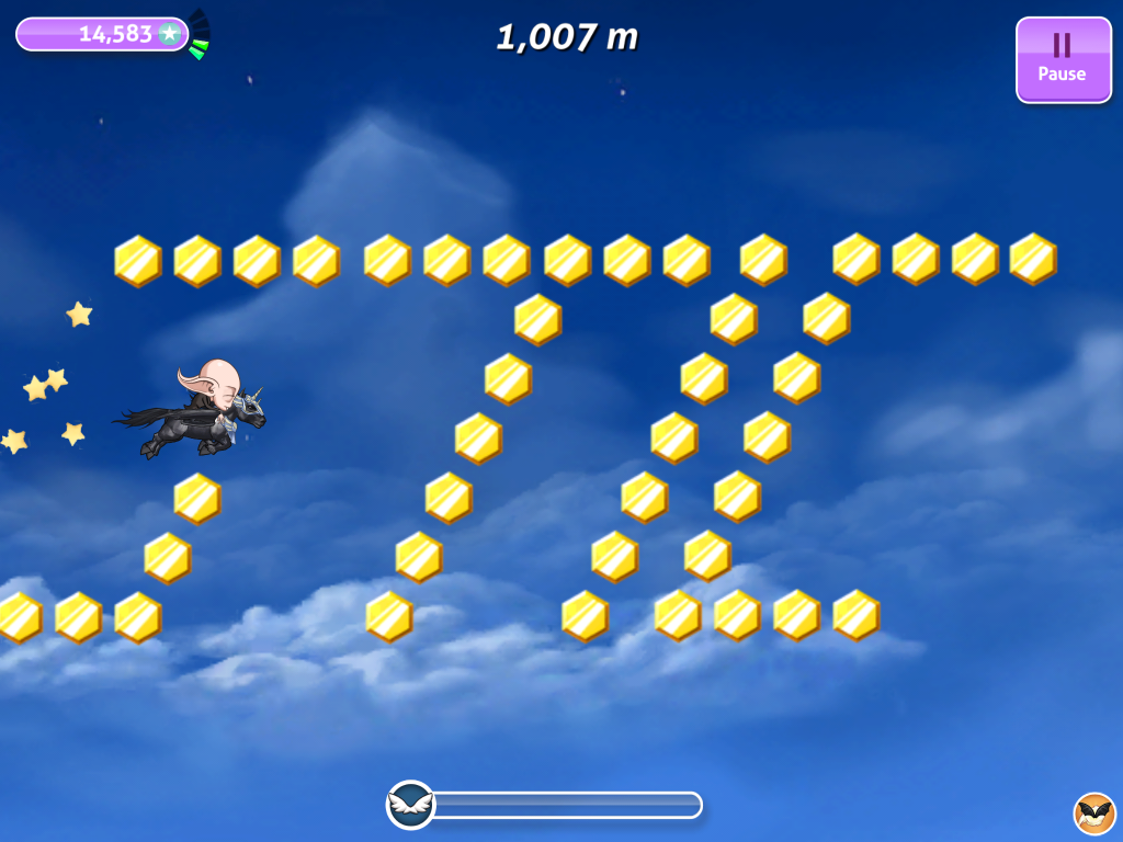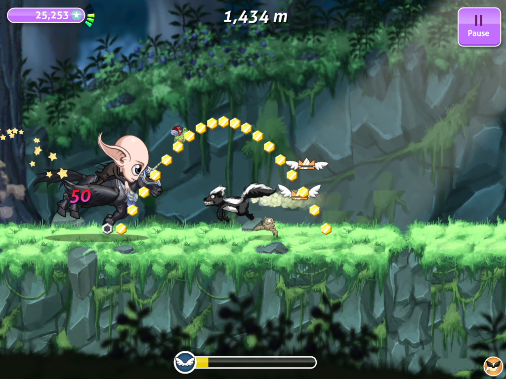 Die Level-ups der Charaktere und Reittiere bringen euch diverse Boni, wie zum Beispiel mehr Punkte, wenn ihr auf Gegner springt, eine längere Flugzeit oder Kronen sammelt. Allerdings ist die In-Game-Währung äußerst knifflig zu verdienen, sodass es um Welten leichter ist, einfach zu einem In-App-Kauf zu greifen. Klar ist dies beabsichtigt, aber ob das Verhältnis zwischen selbst verdientem Gold (und Schädeln, die Premiumwährung) und den Käufen stimmt, muss jede/r für sich entscheiden.