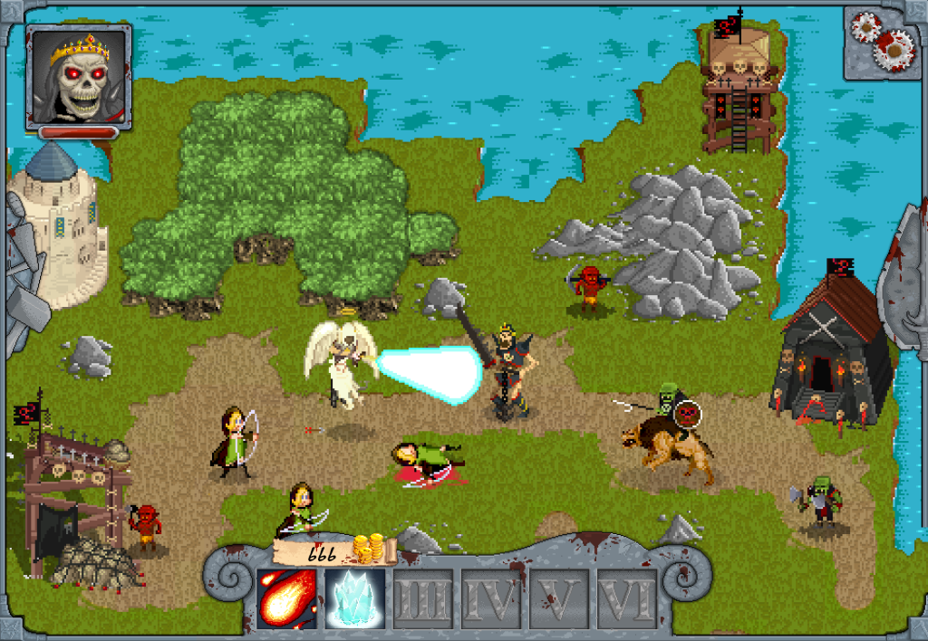 In dem Titel gibt es eine unerreicht bösartige Gottheit, die sich am Diesseits für die Vergangenheit rächen möchte – diese Gottheit ist die/der SpielerIn! Endlich darf man den Guten mal voll auf die Zwölf geben. Das Spiel ist in einem Retro-Pixel-Look gehalten und, wie der Name schon vermuten lässt, ziemlich blutig, nimmt sich dabei aber nicht ernst und ist keineswegs gewaltverherrlichend – na ja, nur ein bisschen.