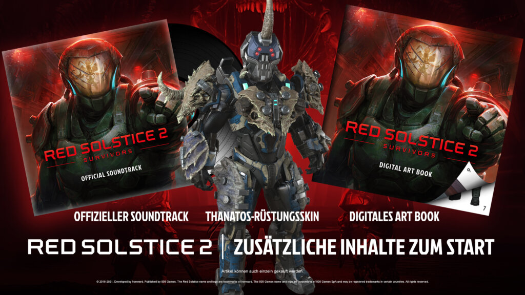 - Thanatos-Rüstungs-Skin: Die nach dem Totengott der griechischen Mythologie benannte Kreatur aus Red Solstice 2: Survivors macht ihrem Namen alle Ehre. Thanatos‘ einzigartigen Ingame-Rüstungs-Skin sollte man sich daher nicht entgehen lassen. Zum Preis von €0,99 kann man damit Furcht auf dem Planeten Mars verbreiten.