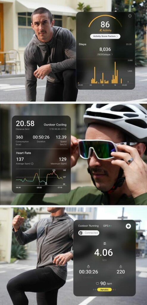 Nun, wenn der Ring am Finger steckt, macht er seine Sache völlig eigenständig, so weit, so gut. Er ist nach IP68-Standard vor Staub und Wasser geschützt, das heißt, ihr müsst ihr in der Praxis auch niemals abnehmen. Duschen, der Abwasch, Tauchgänge oder Sporteinheiten tun dem Gerät absolut nichts – nur bei gewissen Sportarten empfiehlt der Hersteller entweder das Abnehmen des Rings oder einen Protektor. Dazu gehören alle Sportarten, mit denen ihr mit Stangen arbeitet – Gewichtheben, Turnen am Reck und Tennis wären da prädestiniert. Ob ihr allerdings dabei generell einen Ring tragen wollt (smart oder nicht), ist dabei eure persönliche Präferenz. Cool ist, dass ihr Devices wie den RingConn Gen 2 Smart Ring grundsätzlich an jedem eurer Finger tragen könnt, dabei verändern sich die Messungen nur unwesentlich. Das bedeutet, dass ihr immer korrekte und genaue Daten bekommt.