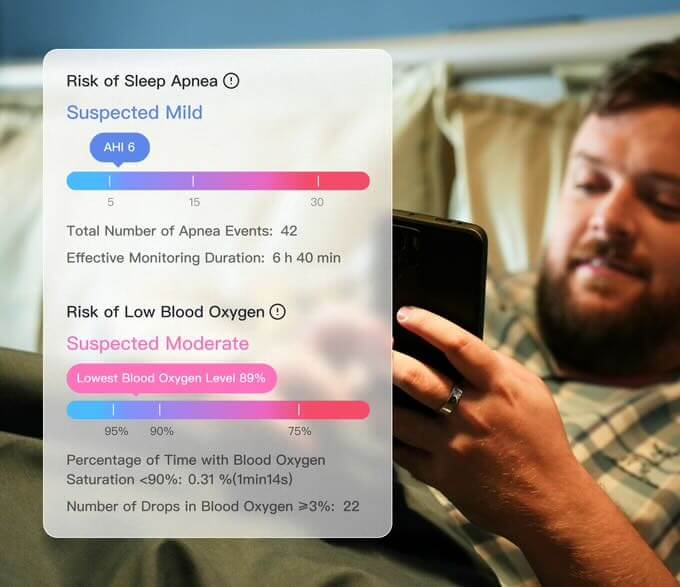 Natürlich müssen wir auch dem Feature, das so etwas wie das Aushängeschild des RingConn Gen 2 Smart Ring ist, einen Absatz widmen. Die Rede ist natürlich vom Schlafapnoe-Tracking, das euch dieser smarte Ring nun neu ermöglicht. Anders als all die anderen Werte, die dieses Produkt so messen kann, müsst ihr das Schlafapnoe-Tracking manuell aktivieren. Damit nicht genug, es reicht nicht nur der Ring aus, sondern auch euer Smartphone muss für die Überwachung in einem Umkreis von etwa zwei Metern liegen. Der Nachttisch ist dafür perfekt geeignet, noch besser, wenn das Smartphone auf einer Ladelösung sitzt. Hauptsache, das Mikrofon hört euch atmen, das ist das Wichtigste! Dann passiert die Magie, und durch ein Zusammenspiel zwischen Schlaftracking des Rings und der Audio-Datei berechnet die RingConn-App dann einen entsprechenden Wert.