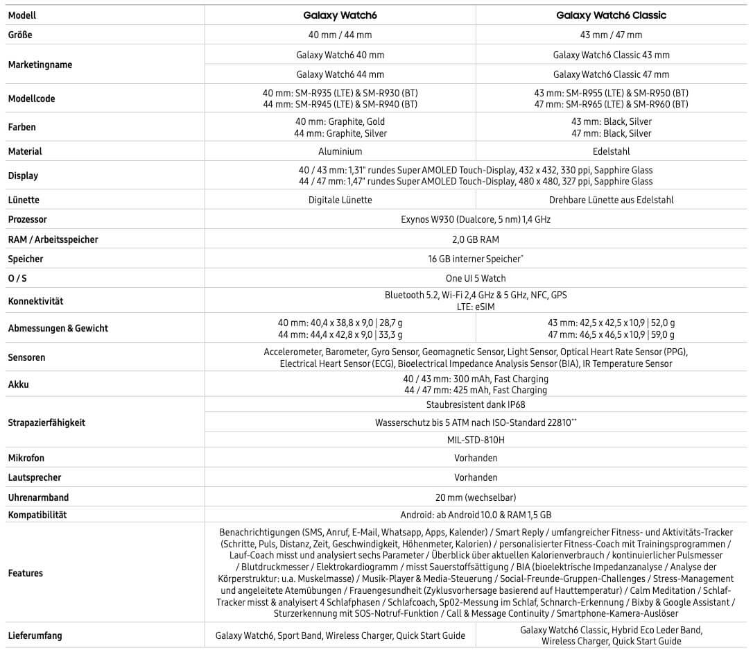 In unserem Test waren wir vom Vorgänger bereits angetan, und diese Stärken will die Samsung Galaxy Watch6-Serie natürlich weiter ausspielen. Ein größeres Display, Staub- und Wasserschutz nach IP68, mehr Akkuleistung und ein hoher Grad an Personalisierbarkeit tun jedem Gerät gut. Vor allem kann euer Schlaf- und Gesundheitscoach euer körperliches Wohlbefinden im Blick behalten, während ihr keinen Gedanken daran verwenden müsst. Sowohl Schlaf, Zyklus als auch Trainings lassen sich so ideal trocken, und die Unterschiede zwischen der regulären Uhr und einer Watch6 Classic sind rasch aufgezählt. Die Größen sind anders (40 und 44 mm, und 43 und 47 mm bei der Classic), das Material unterscheidet sich (Aluminium vs. Edelstahl bei der Classic), aber alles andere ist komplett gleich. Sehr gut, gerade bei so etwas Persönlichem wie einer Armbanduhr!