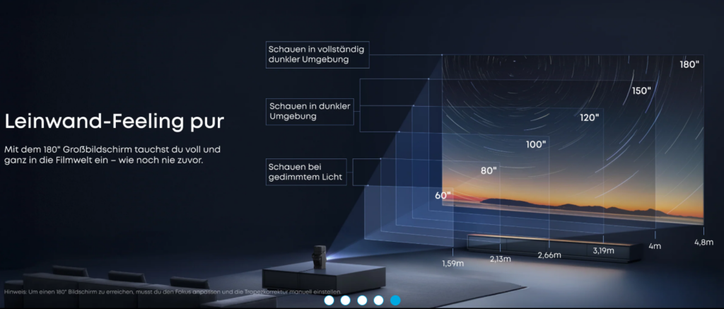 Die IEA 4.0 ntelligenz umfasst mehrere Funktionen im Detail: Der Projektor nutzt Echtzeit-Autofokus Trapezkorrektur, um das Bild blitzschnell scharf und rechteckig zu machen. Hinzu kommen die automatische Hindernisvermeidung, die das Bild bei Objekten im Weg anpasst. Es eliminiert die lästige Setup-Prozedur, die man von älteren Beamern kennt. Die Geschwindigkeit und Flexibilität, mit der ihr euer Heimkino von einer Wand oder Decke zur nächsten verlegen könnt, ist beeindruckend. Dieses vollautomatische Readjusting ist super praktisch und mittlerweile ein Grundfeature, das von Beamern verlangt wird.