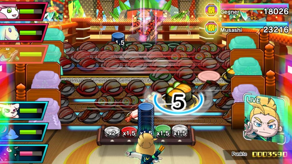 Dann gibt es Sushi-Geister wie Jinrai, die euch und eurem Gegenüber zur Seite stehen. Habt ihr genügend Teller gematcht, dürft ihr deren Zauber auslösen. Plötzlich verlangsamt sich das Geschehen, oder verschnellert sich, alle Teller besitzen die selbe Farbe, oder ihr könnt euch mit einem Schild vor Schaden schützen!