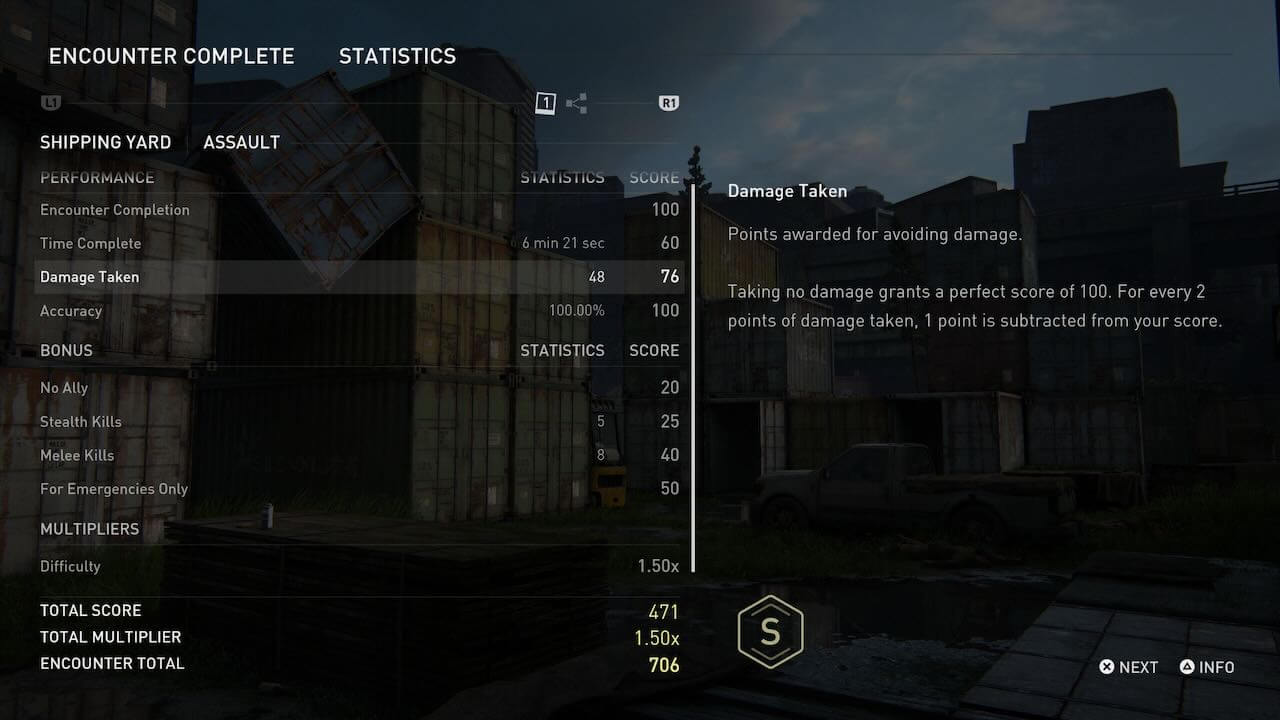 Jedes Mal, wenn ihr das Ziel dann erreicht (Welle besiegen, Feind beseitigen, zwei Minuten lang überleben, …), bekommt ihr dafür Belohnungen. So häuft ihr dann die aus der Kampagne bereits bekannten Komponenten frei, um entweder eure Ausrüstung hochzustufen oder euren Charakter zu verbessern. Letzteres behaltet ihr euch natürlich zwischen den Läufen oder nach eurem Tod bei, sodass „Kein Zurück“ euch immer und immer wieder mit Fortschritt belohnt – ein ganz klares Roguelike-Thema. Denn wenn ihr bei einer Mission mal sterben solltet, ist dieser Lauf beendet, und so ein Lauf besteht eigentlich immer aus sechs Konfrontationen nacheinander. Am Ende wartet auch gerne ein Bossgegner, den man entweder bereits kennt oder auch nicht. Dadurch, dass ihr hier aber in Wahrheit nur ein Leben habt, steigt da die Adrenalinrate enorm. Kann The Last of Us Part 2 Remastered da überzeugen? Ja!