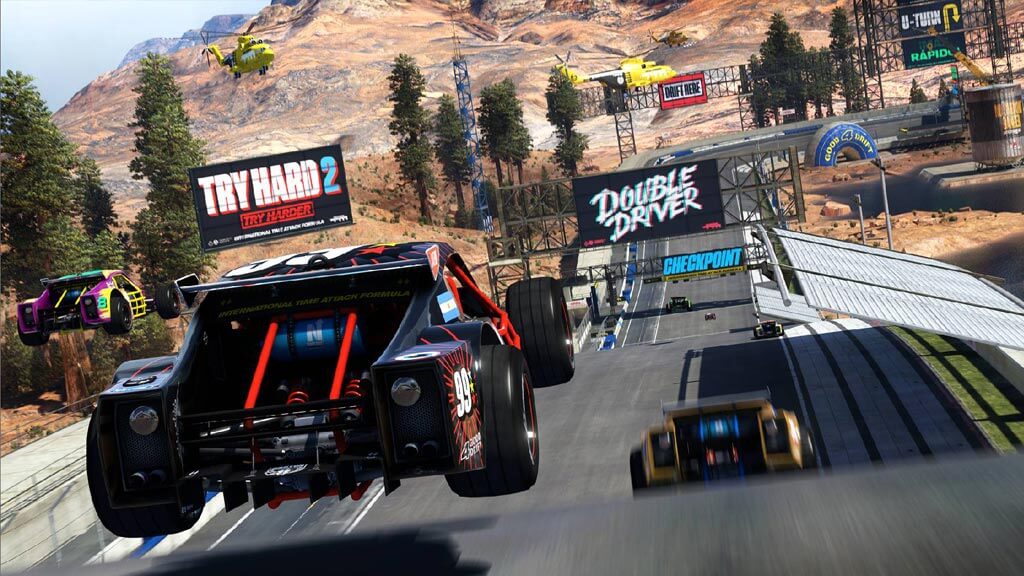 Wer sich jetzt Sorgen macht, dass deshalb für nicht ganz so hartgesottene Gamer das Ende der Fahnenstange bald erreicht ist, liegt aber falsch. Neben dem „Story“-Modus gibt es noch einige andere Spielmodi zu entdecken. Nicht alle Spielarten und Optionen machen dabei aber auch wirklich Sinn. So wirkt die Garage mit ihren recht dürftigen Customizing-Optionen etwas lieblos und der Double-Driver-Modus, bei dem ihr euch zu zweit koordinieren müsst – ihr steuert hier gemeinsam ein Auto –, macht genau bis zur ersten Kurve Spaß. Spätestens dann stellt sich nämlich die Frage, wie der Twitch-Plays-Abklatsch seinen Weg ins Spiel gefunden hat. Im komplexen Editor, den man auch als vereinfachte Einsteigervariante nutzen kann, baut der geneigte Spieler seine eigenen Pisten und stellt diese anderen Racern zur Verfügung. Auch wenn das Basteln und Editieren nicht jedermanns Sache ist und viele Spieler den Editor wahrscheinlich gar nicht nutzen werden, sorgt er für einen potentiell endlosen Strom an frischen Levels – und davon profitieren alle Trackmaniacs.