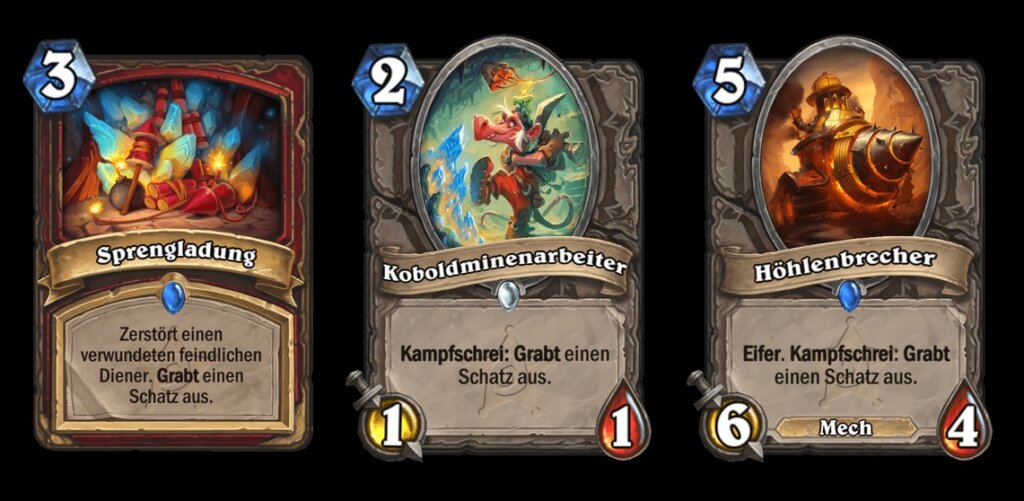 In diesen Hügeln schlummert ein Schatz! Karten mit dem Schlüsselwort Ausgraben holen eure Schätze aus der Azeritmine. Bei jedem Ausgraben grabt ihr tiefer und findet seltenere Schätze! In eigenen Worten: Wenn ihr eine Karte mit Ausgaben spielt, so wird eine Art Kampfschrei aktiviert – mit einem entscheidenden Unterschied. Je öfter ihr Ausgraben in einem Spiel einsetzt, desto besser wird die Belohnung, die ihr aus der Azeritmine holt.
